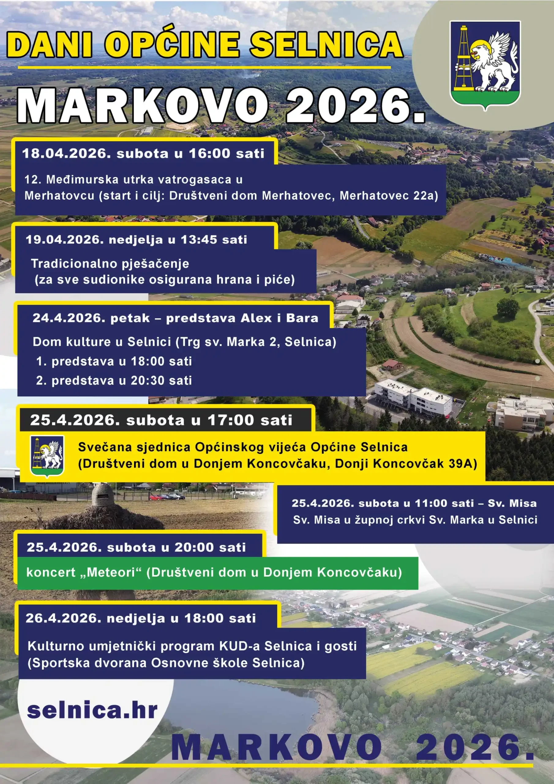 25.4.2026. subota u 17:00 sati – Svečana sjednica Općinskog vijeća Općine Selnica (Društveni dom u Donjem Koncovčaku, Donji Koncovčak 39A)