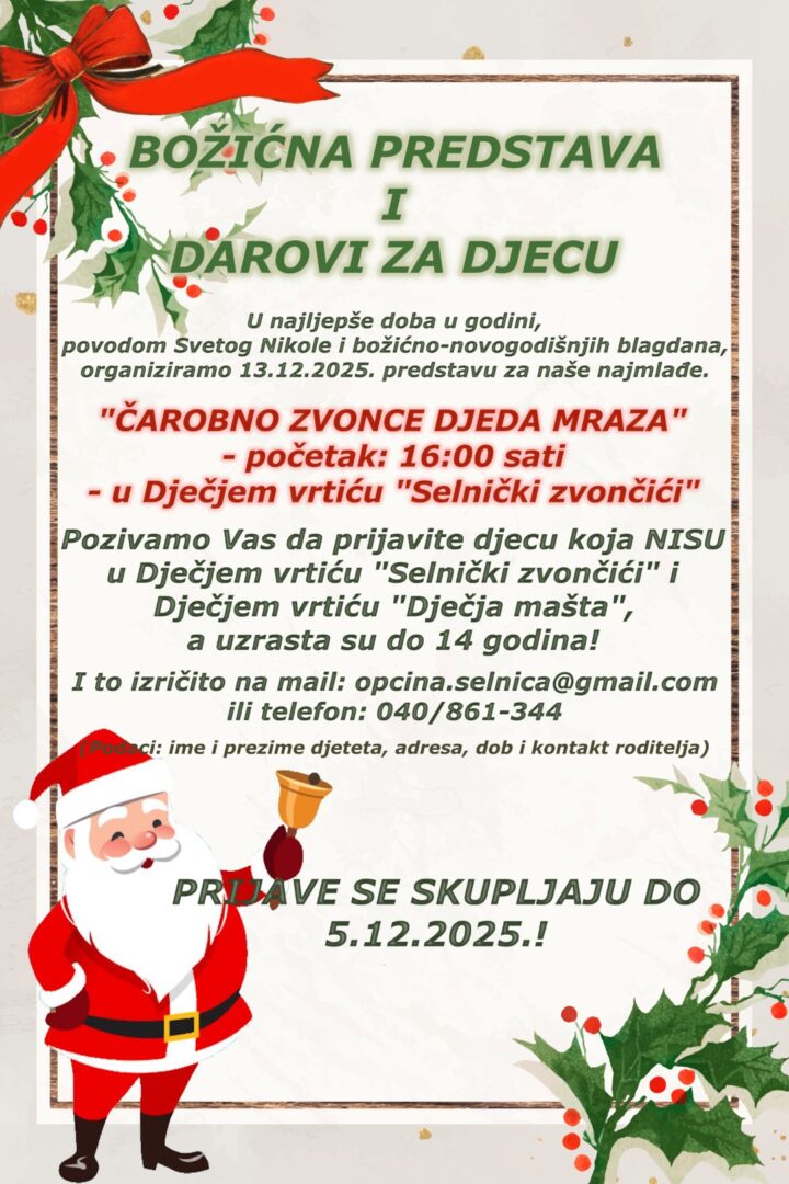 U najljepše doba u godini, povodom Svetog Nikole i božićno-novogodišnjih blagdana, organiziramo 13.12.2025. predstavu za naše najmlađe. "ČAROBNO ZVONCE DJEDA MRAZA" – početak: 16:00 sati– u Dječjem vrtiću "Selnčki zvončići" Pozivamo Vas da prijavite djecu koja NISU u Dječjem vrtiću "Selnčki zvončići" i Dječjem vrtiću "Dječja mašta", a uzrasta su do 14 godina!...
